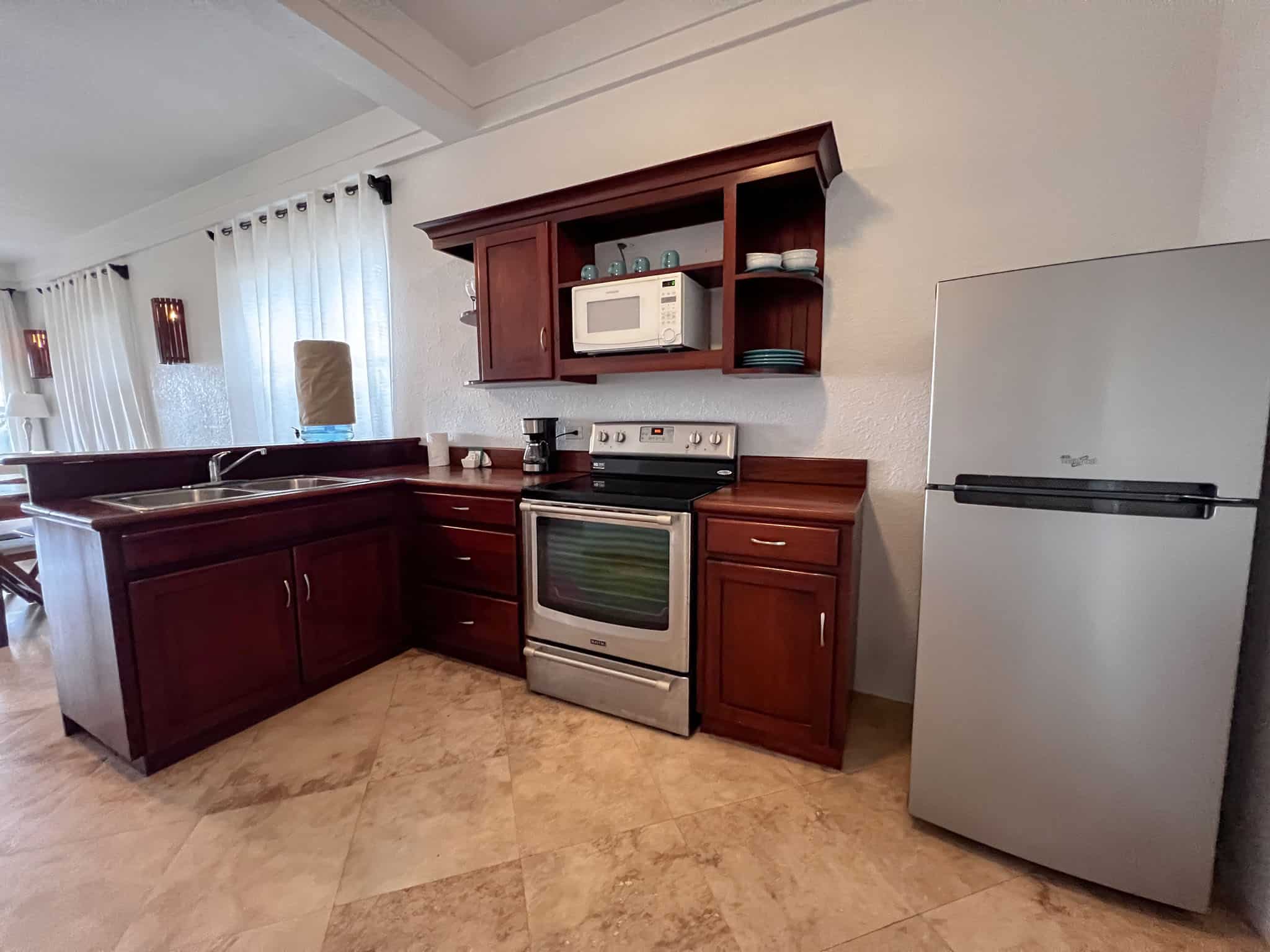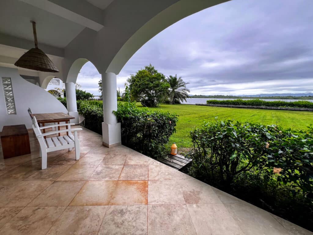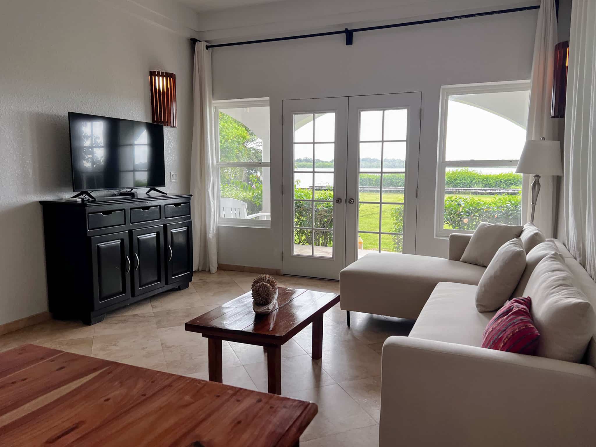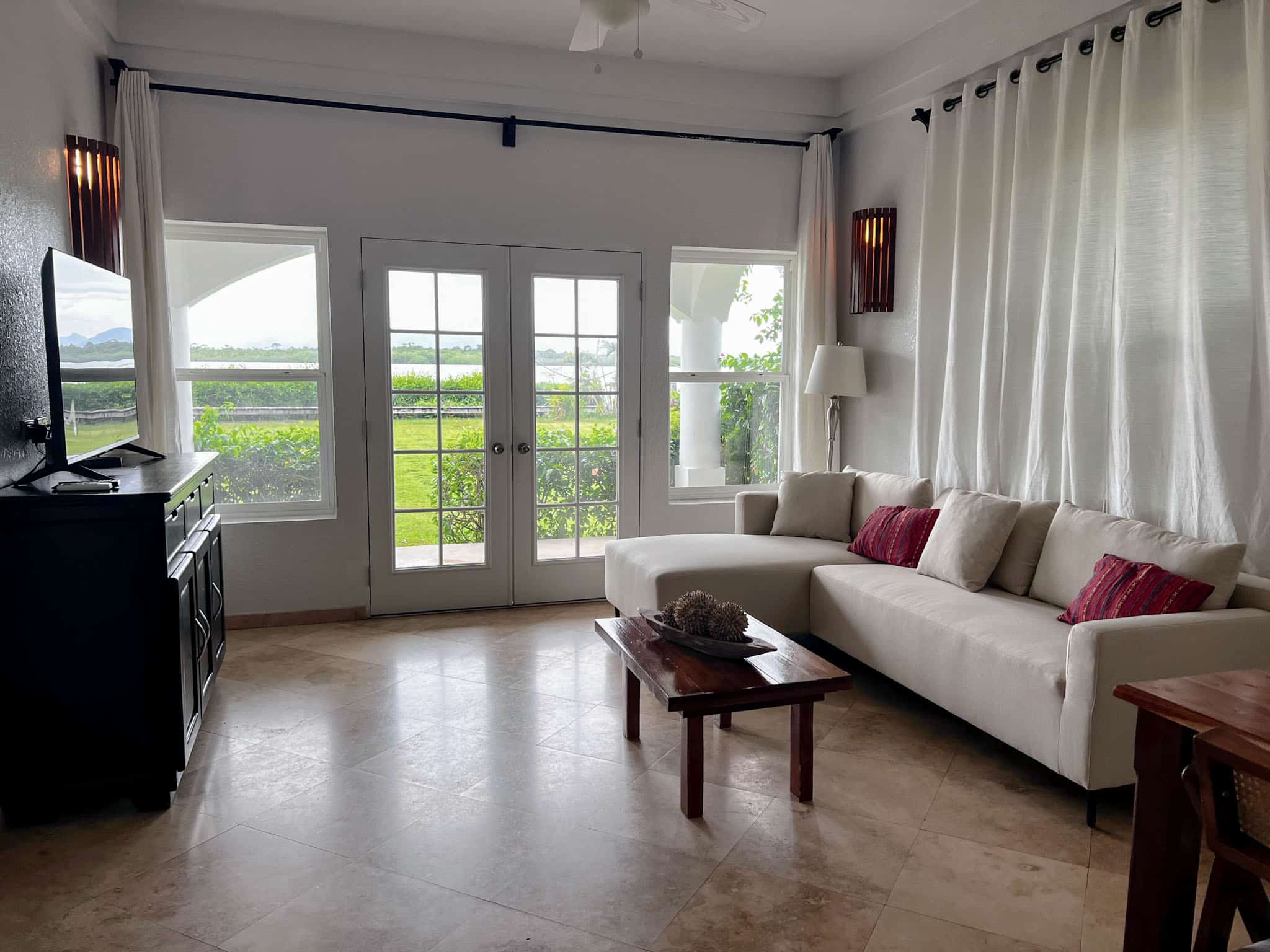 Inside, the space feels bright and welcoming, enhanced by additional side windows that fill the living and dining areas with natural light. The private patio opens to peaceful lagoon views and stunning sunsets over the Maya Mountains—an ideal setting to relax and unwind.